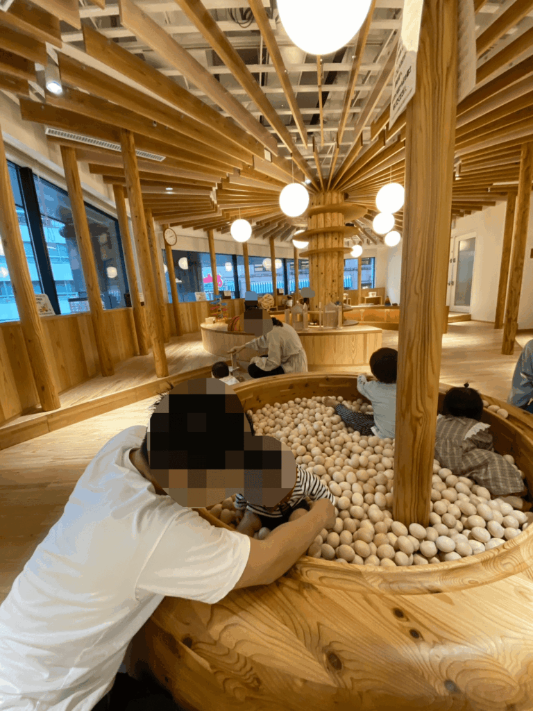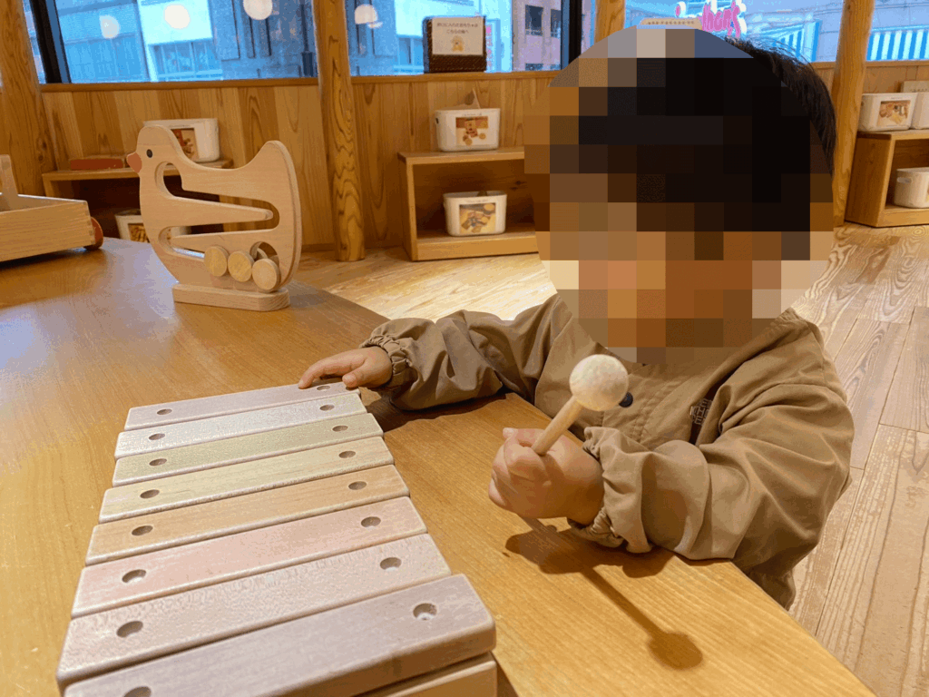 木のボールプールや木琴、木製のおもちゃに興味を示し、楽しそうに過ごしていました。